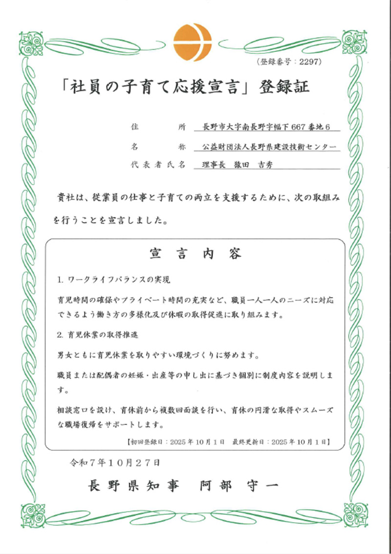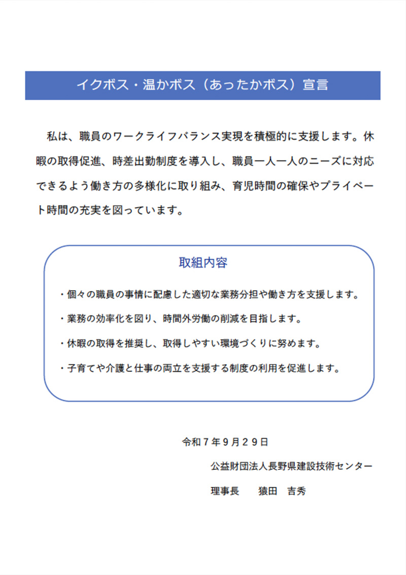 また、令和7年9月には「イクボス・温かボス宣言」、令和7年10月には「社員の子育て応援宣言」を表明し、男女とも仕事と育児、介護の両立ができる働きやすい職場づくりに取り組み、職員のワークライフバランスの実現を積極的に支援することを宣言いたしました。